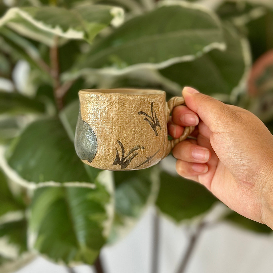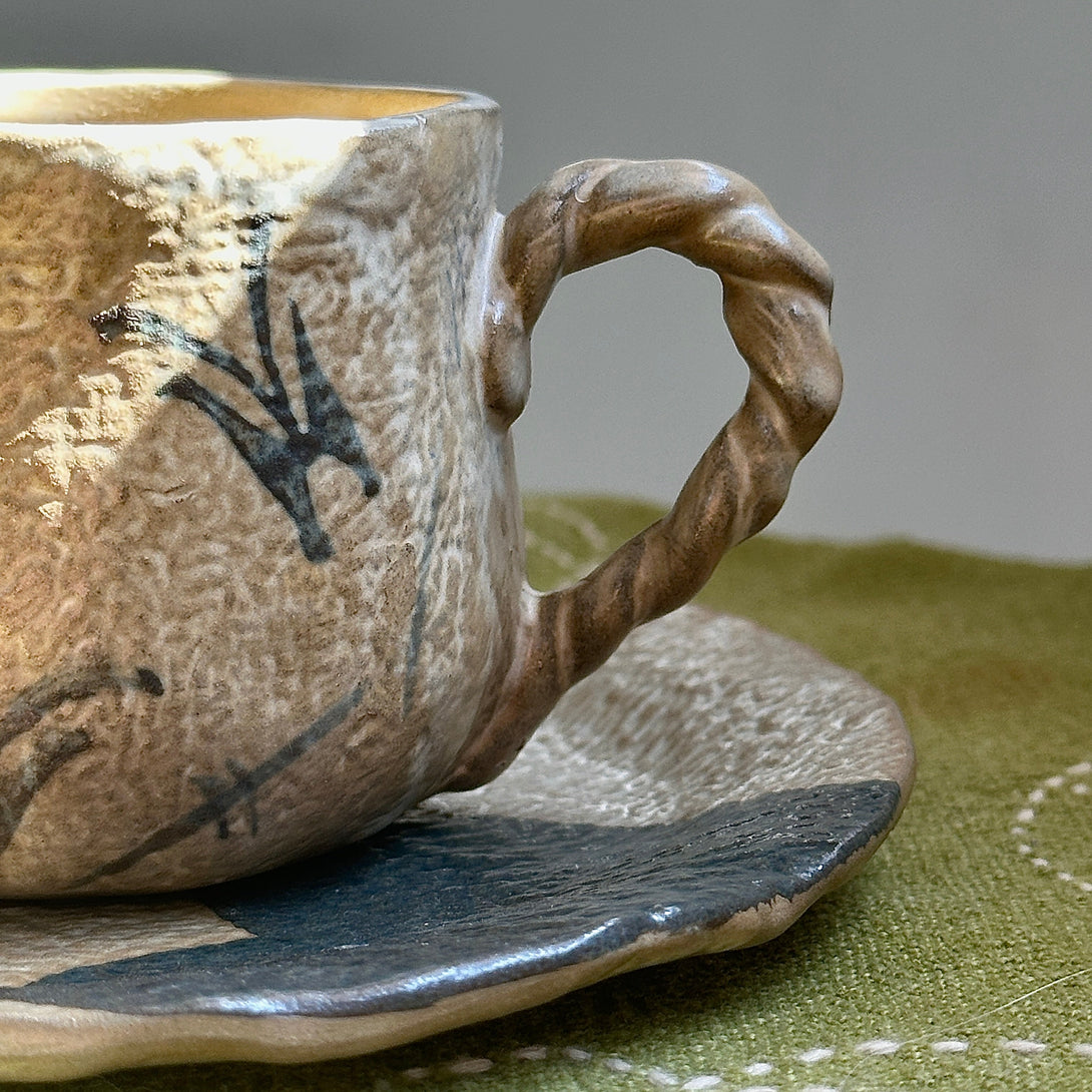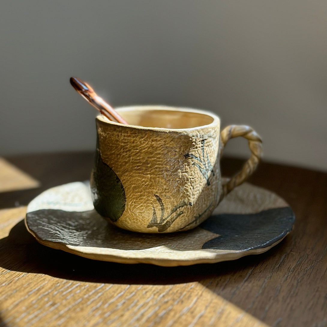 Vintage-inspired with a touch of artistry. This hand-embossed ceramic cup & saucer set brings a tactile experience to your coffee or matcha rituals. Its intricate textures, earthy beige tones, and deep green accents make it a refined choice for any tea or coffee lover.