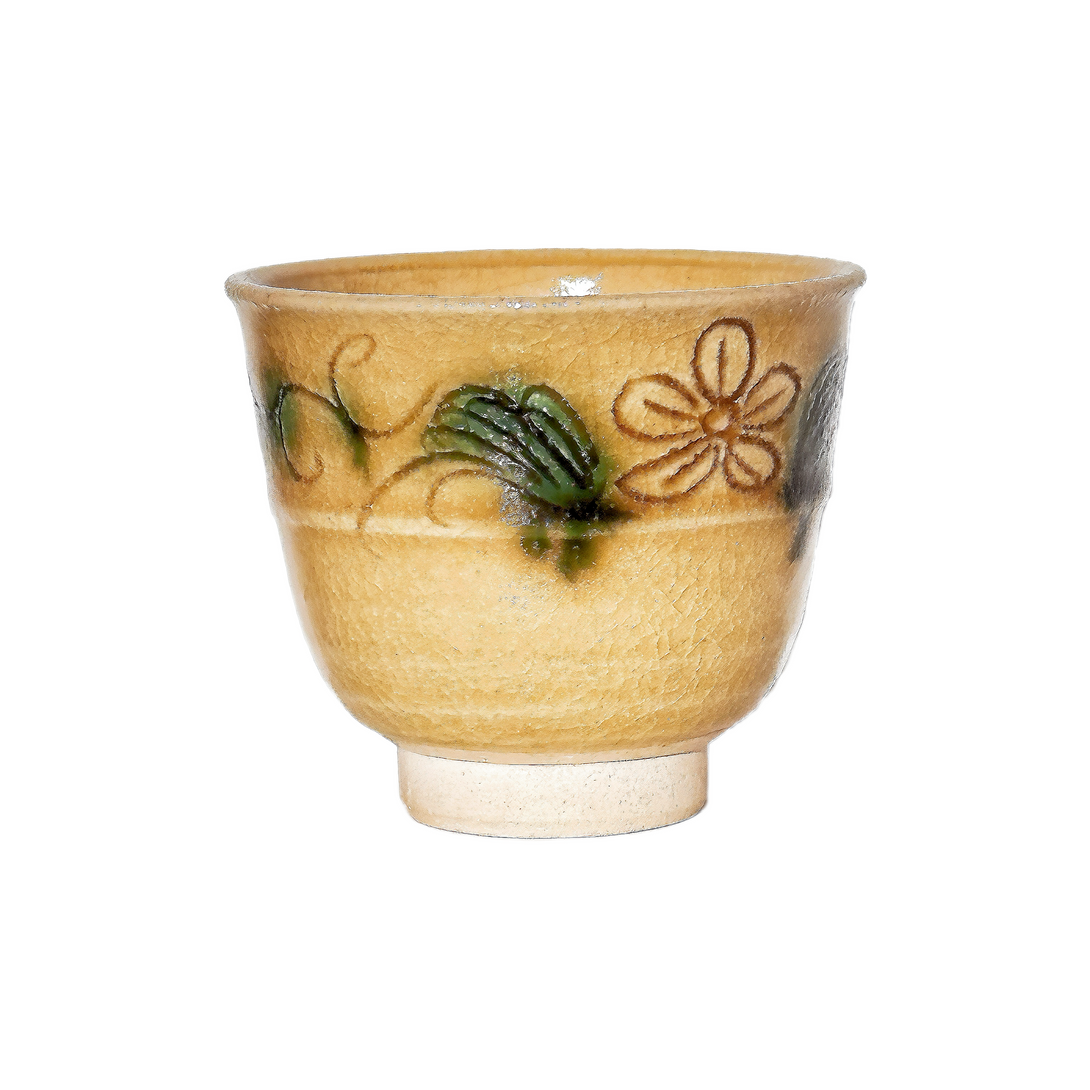 The Masao Nakajima Yellow Seto Handcrafted Teacup and Yunomi Cup is a beautifully crafted piece of Japanese pottery. Featuring a warm yellow glaze, this teacup is adorned with intricate floral and leaf motifs that enhance its traditional aesthetic. The cup’s handcrafted nature ensures that each piece is unique, reflecting the artisan's dedication to quality and detail.